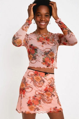UO 90s Pink Dragon Print Mesh Lettuce Edge Crew Neck Top pink S