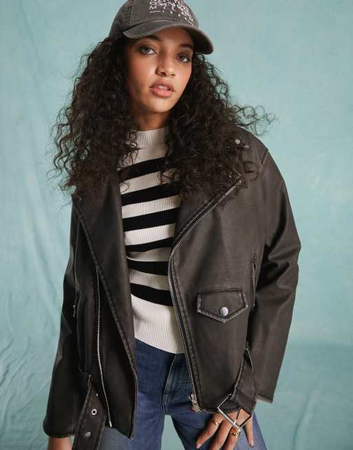 Miss Selfridge faux leather oversized padded biker jacket in washed black