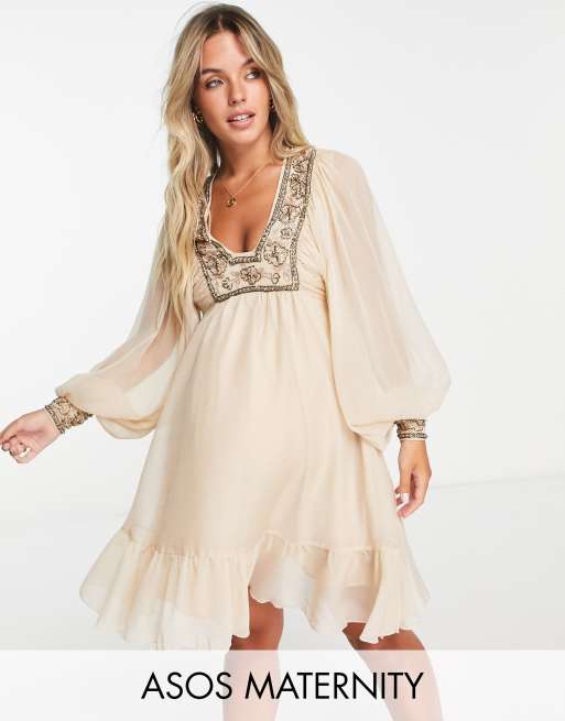 ASOS DESIGN Maternity blouson sleeve mini dress with floral embellished bodice detail in stone